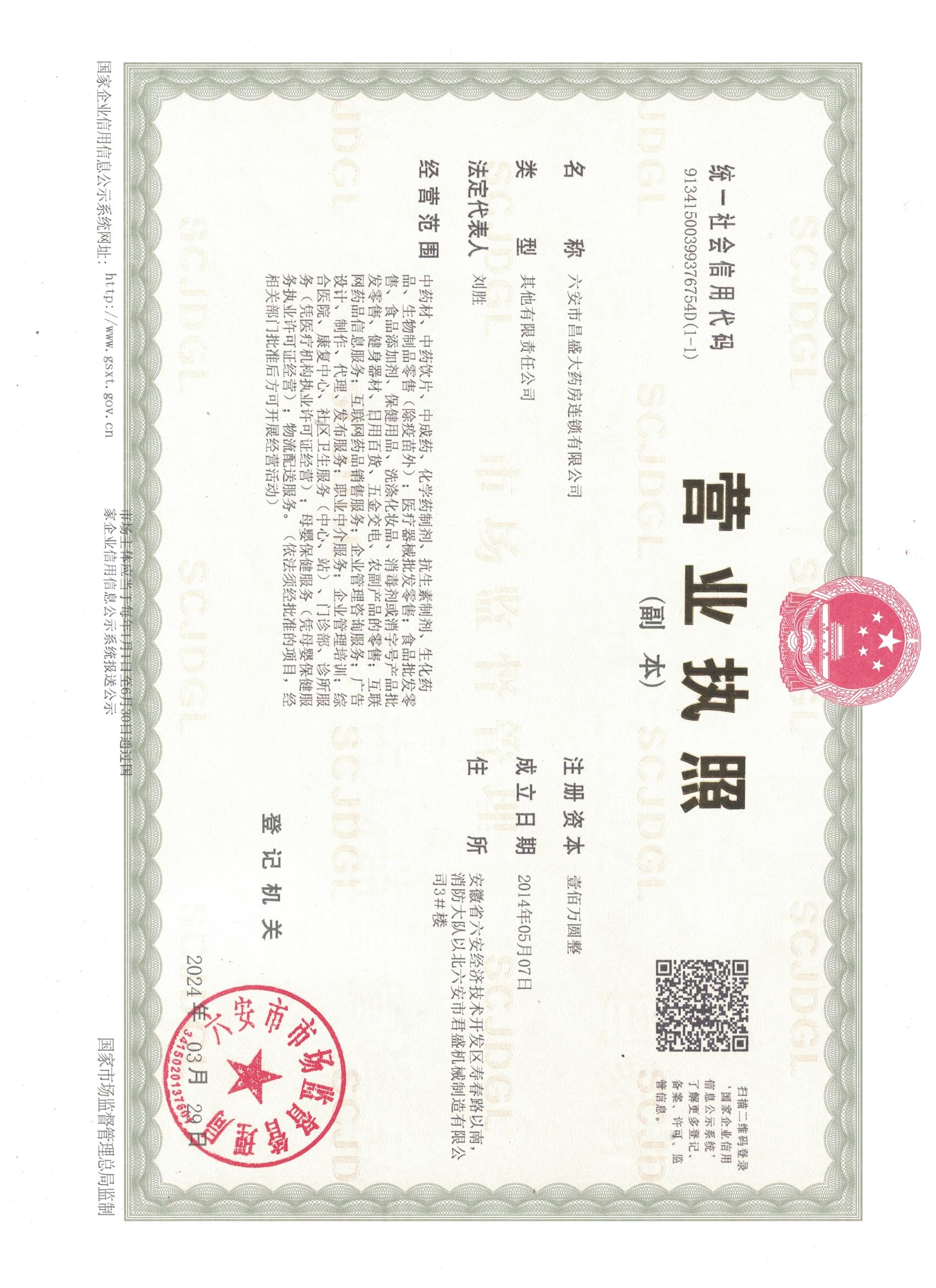 六安市昌盛大藥房連鎖有限公司 互聯(lián)網(wǎng)藥品資格證書編號:(皖)-非經(jīng)營性-2019-0070